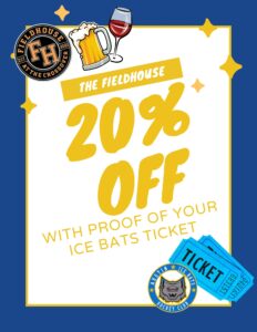 Don’t miss out on this exciting offer! Show your ticket on home game days at The Fieldhouse and enjoy 20% off your tab. Support your local hockey team, enjoy great food, and make your game day experience unforgettable.